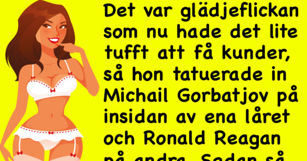 Det här ägde rum på 1980-talet. Det var då den rödhåriga, oanständiga glädjeflickan som hade tatuerat Michail Gorbatjov på insidan av ena låret och Ronald Reagan på den andra sidan. Om kunden kände igen någon ...